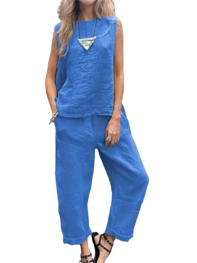 الصيف القطن الكتان مجموعات المرأة الصلبة عادية قطعتين مجموعات موضة جديدة مثير الخامس الرقبة سترة دون أكمام القمم والسراويل دعوى النساء