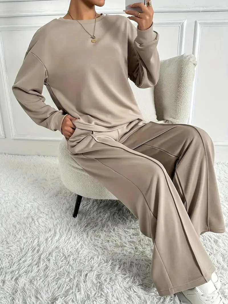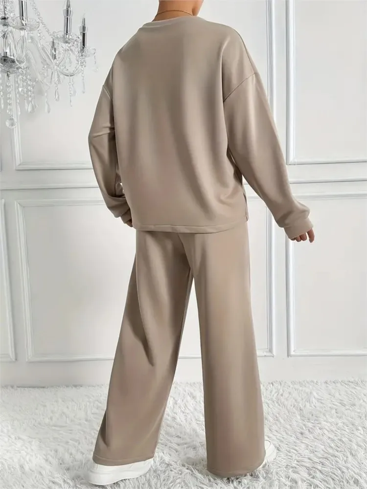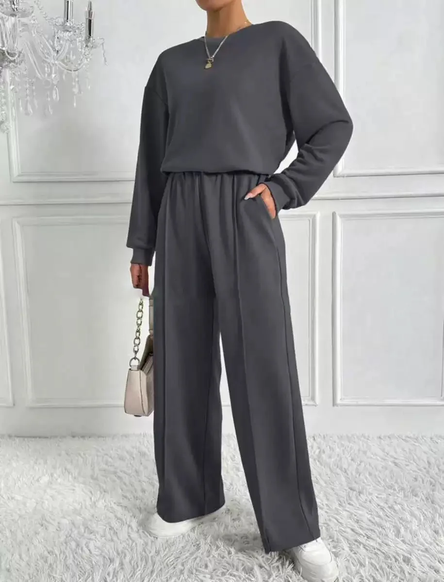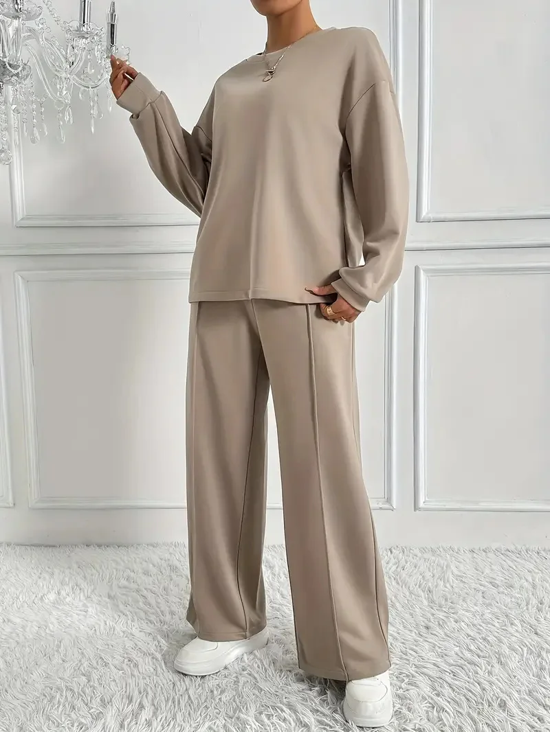 طقم مكون من قطعتين للنساء، سويت شيرت كاجوال برقبة دائرية وأكمام طويلة، بنطال واسع الساق يناسب الخريف والشتاء، أزياء السيدات للمكتب