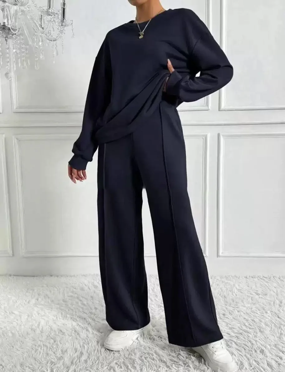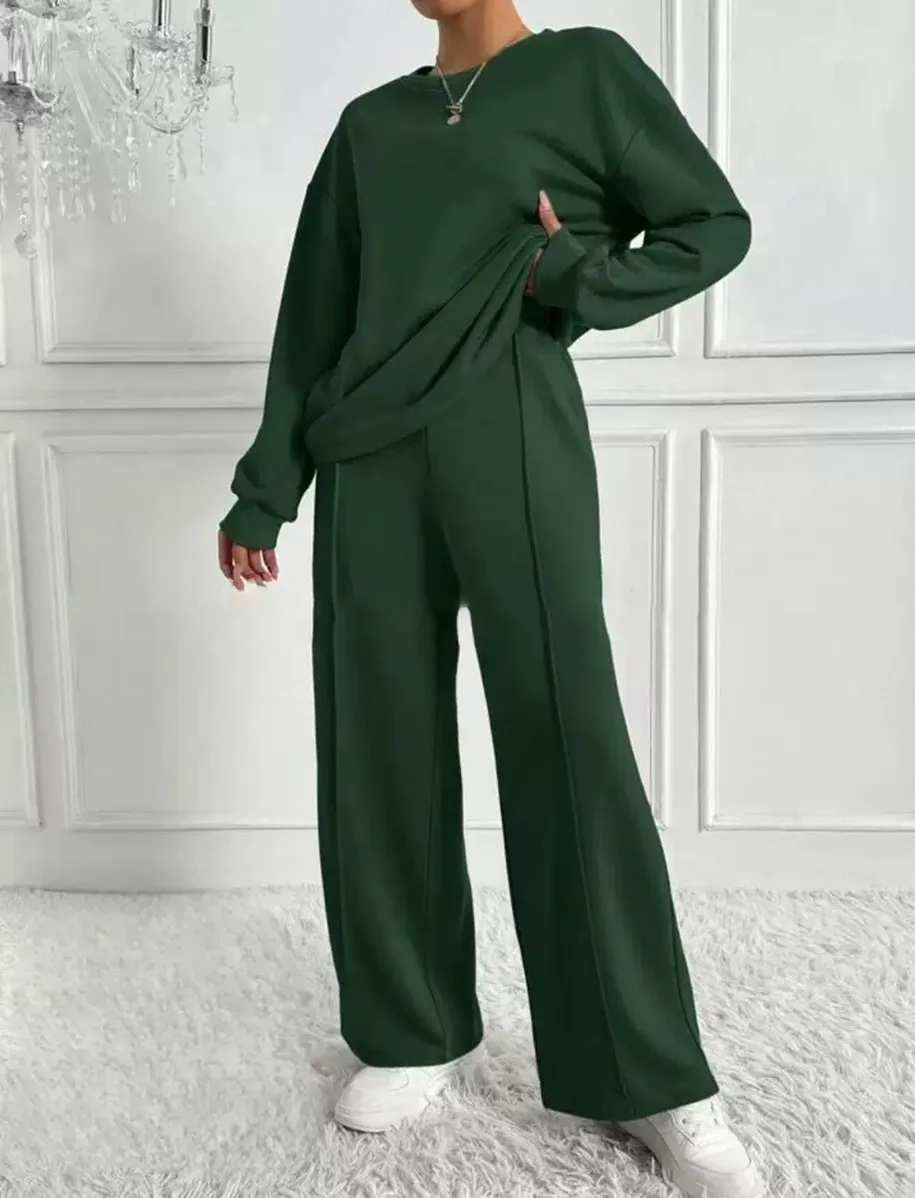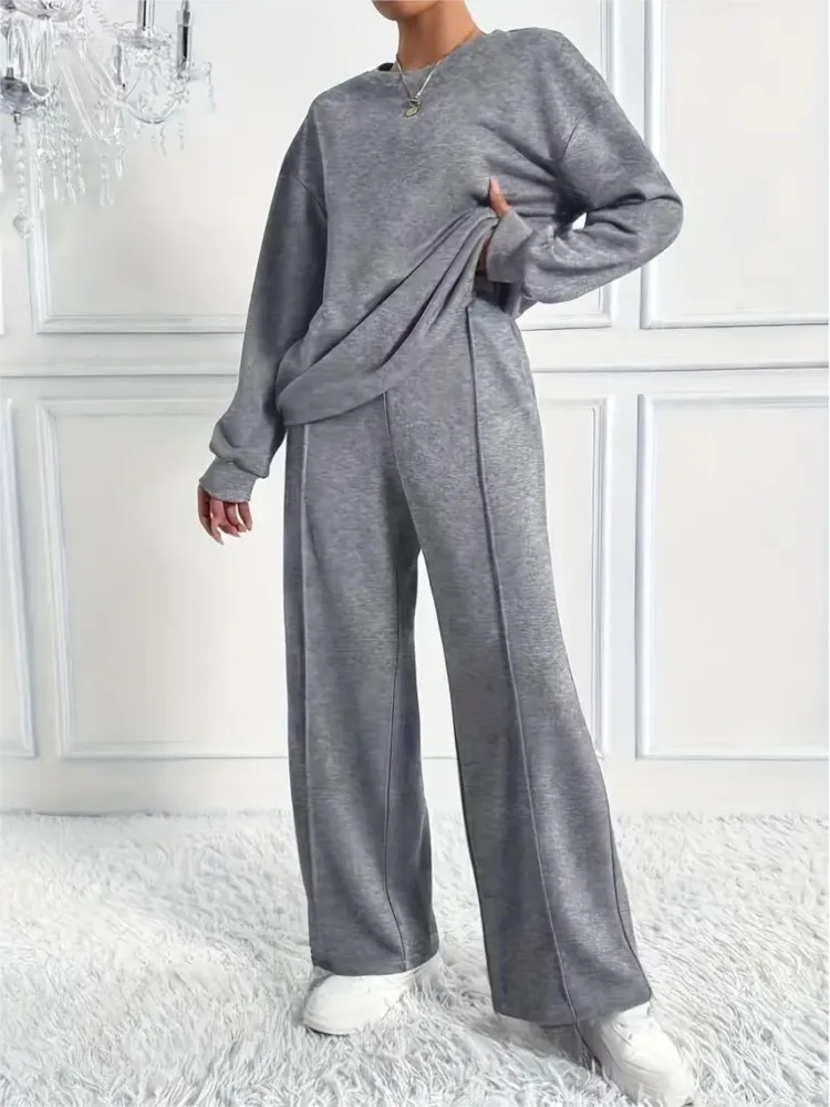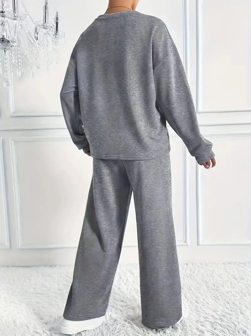 طقم مكون من قطعتين للنساء، سويت شيرت كاجوال برقبة دائرية وأكمام طويلة، بنطال واسع الساق يناسب الخريف والشتاء، أزياء السيدات للمكتب