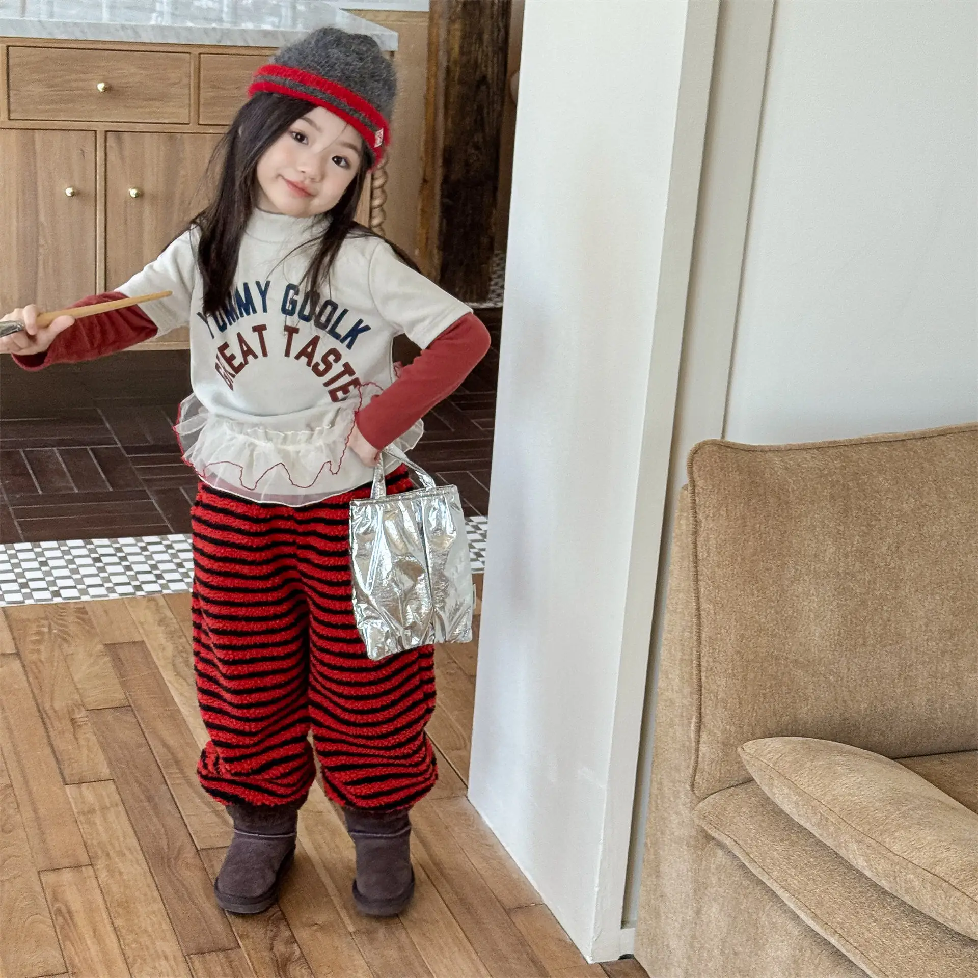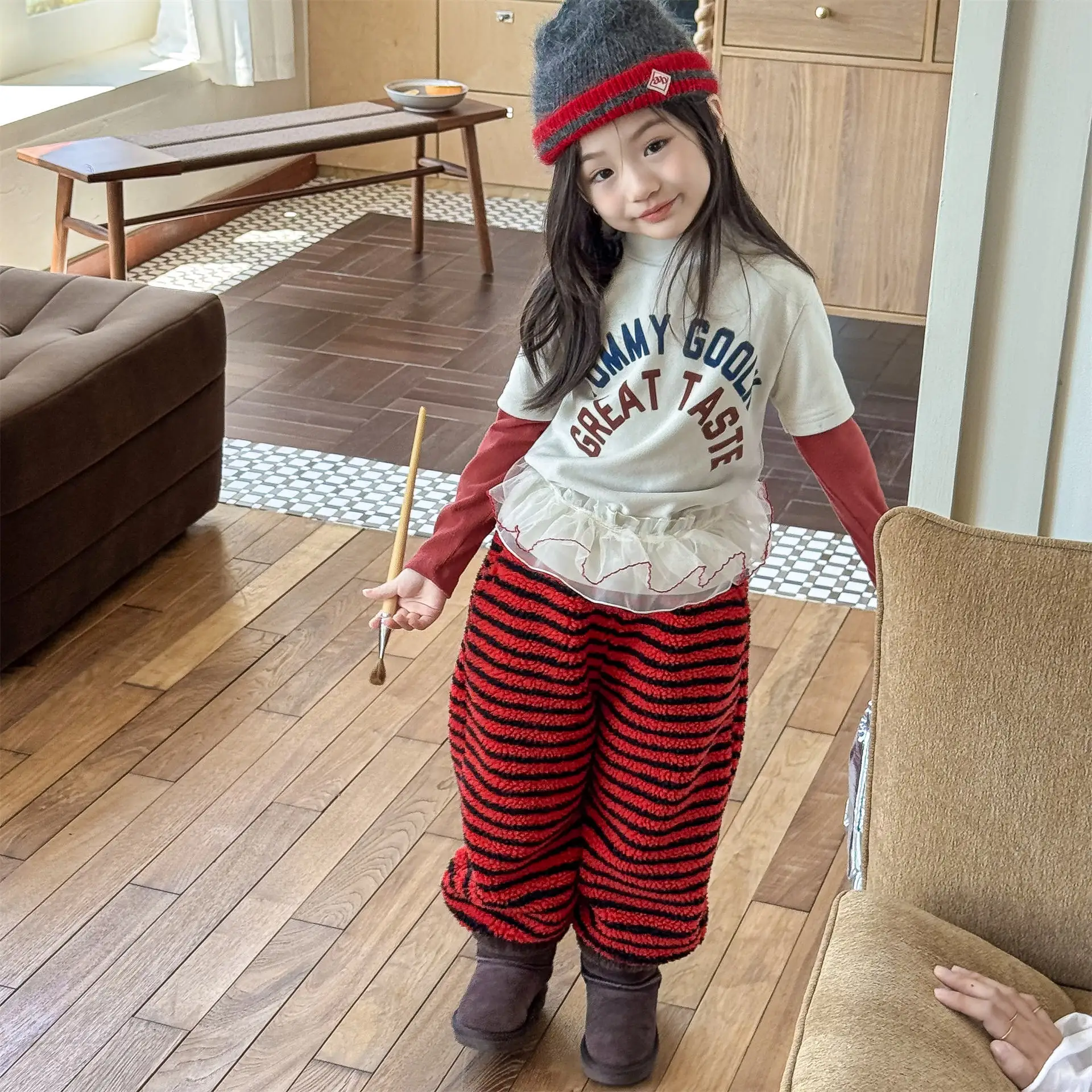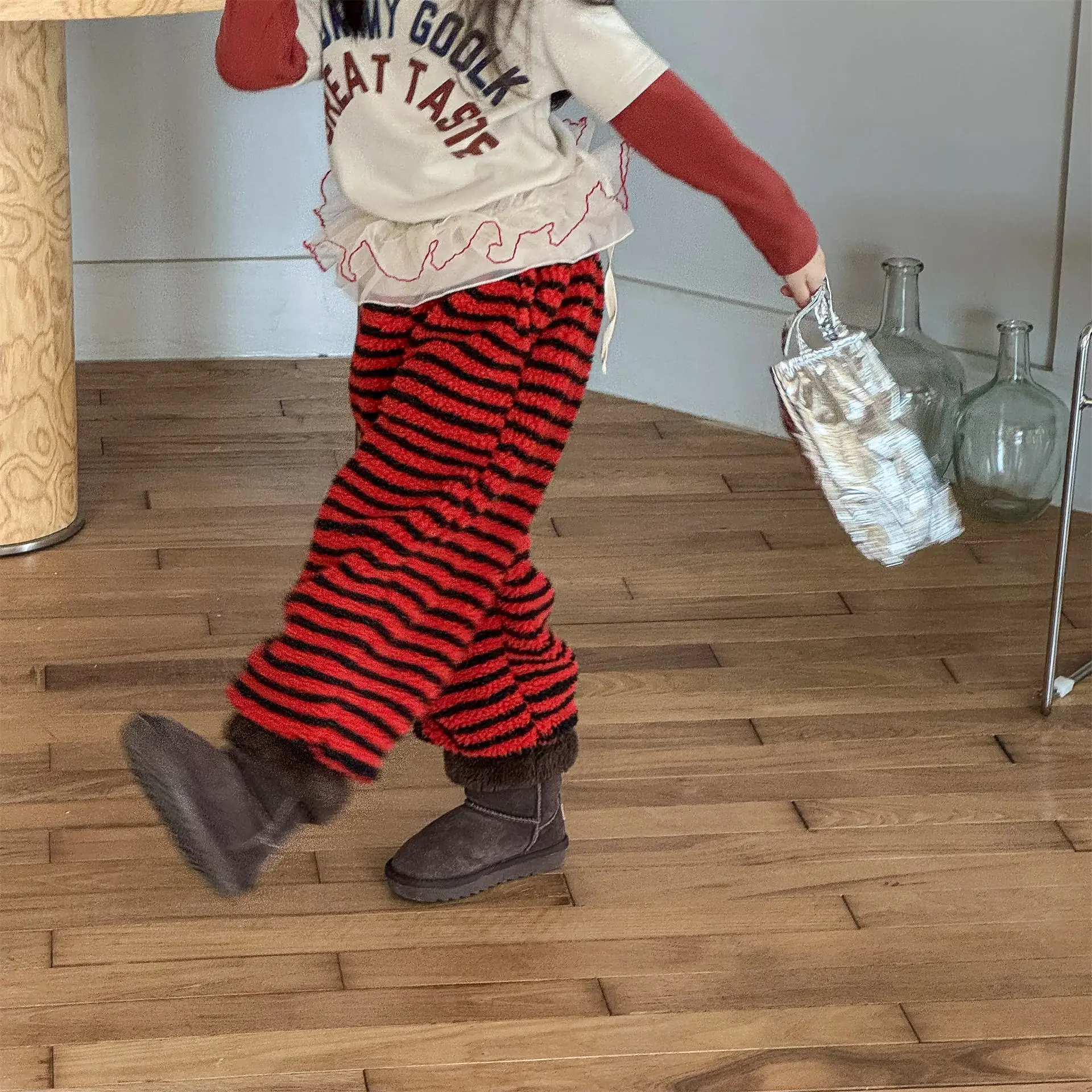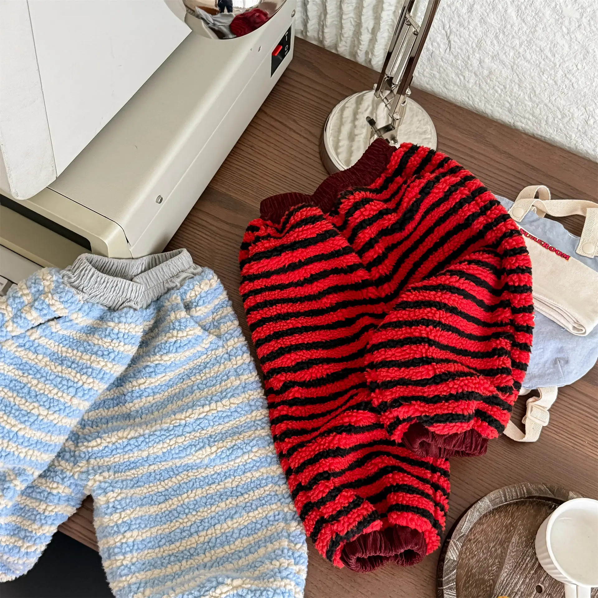 ملابس أطفال شتوية من LILIIGIRL 2025 سراويل مخططة للفتيات وبطانة من الفرو سراويل للأولاد دافئة على الطراز الكوري سراويل سميكة للأولاد