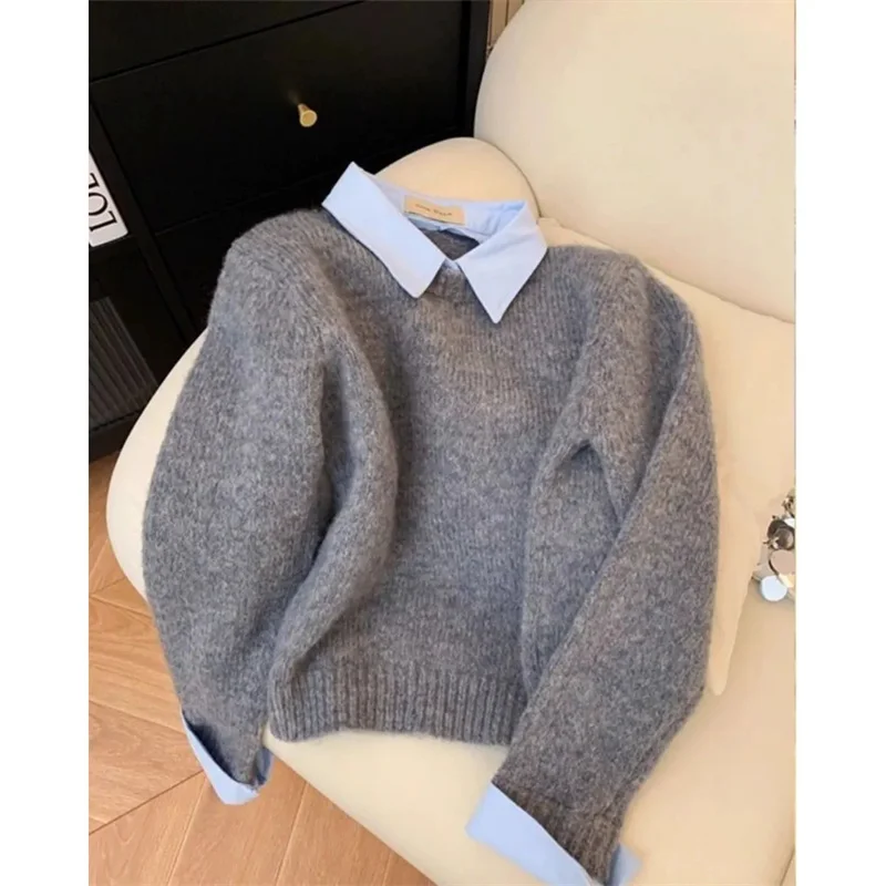 وهمية اثنين من القمصان طوق سترة المرأة الخريف الزي جديد كسول Linterior المتناقضة اللون رمادي متماسكة سترة مع الوجه طوق