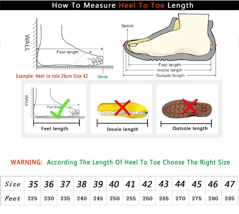 1.Choose the size according to your foot length (Don/’t choose size according to your country usual size !!!)