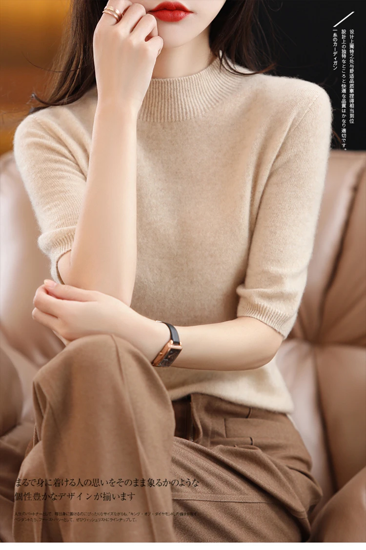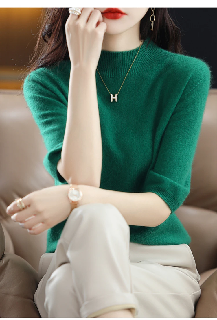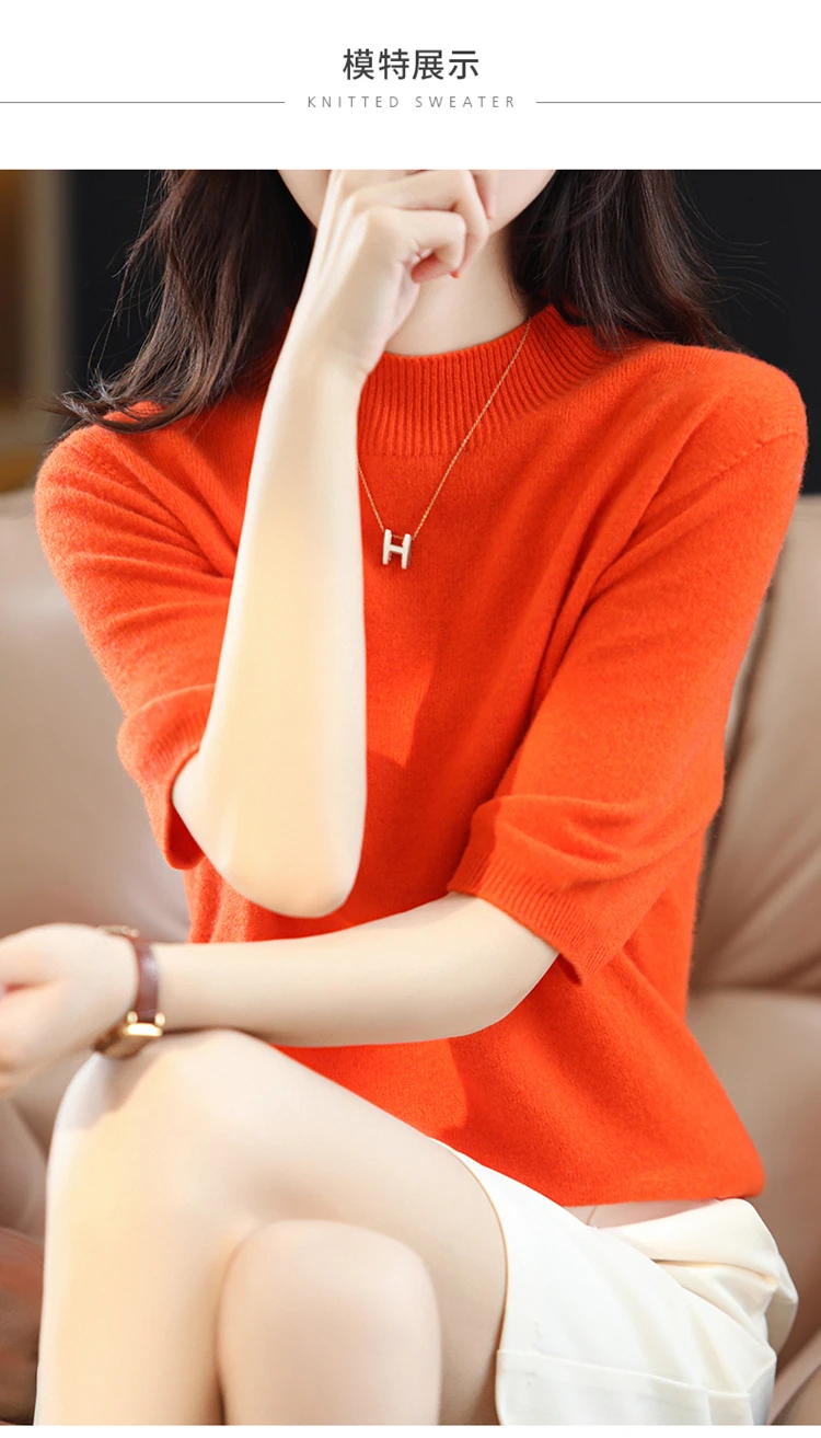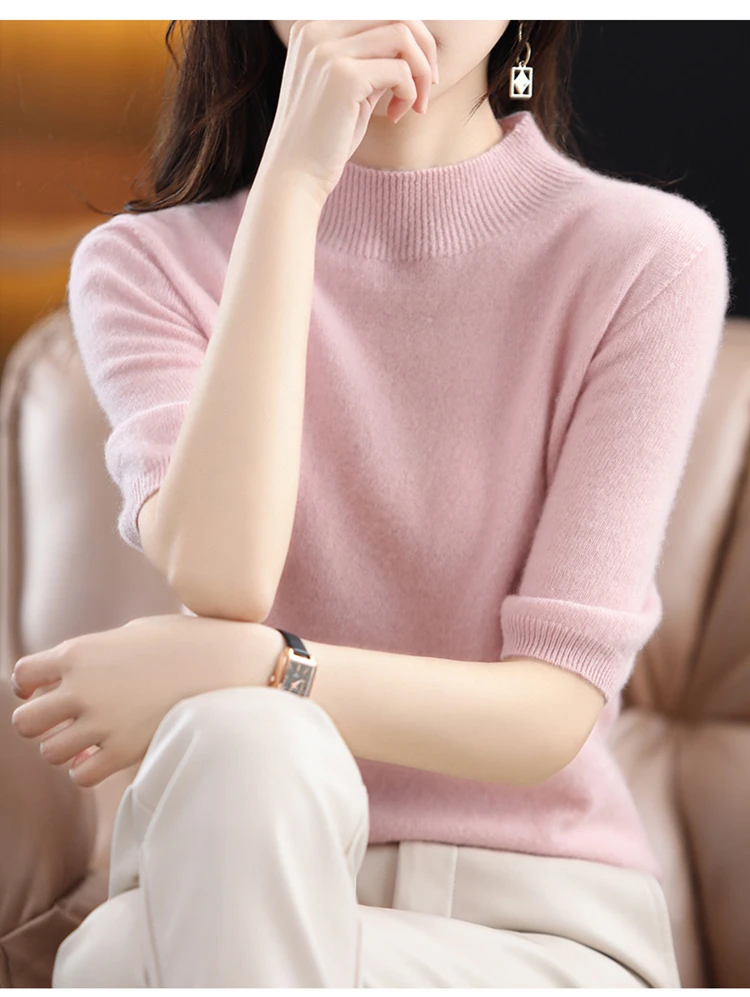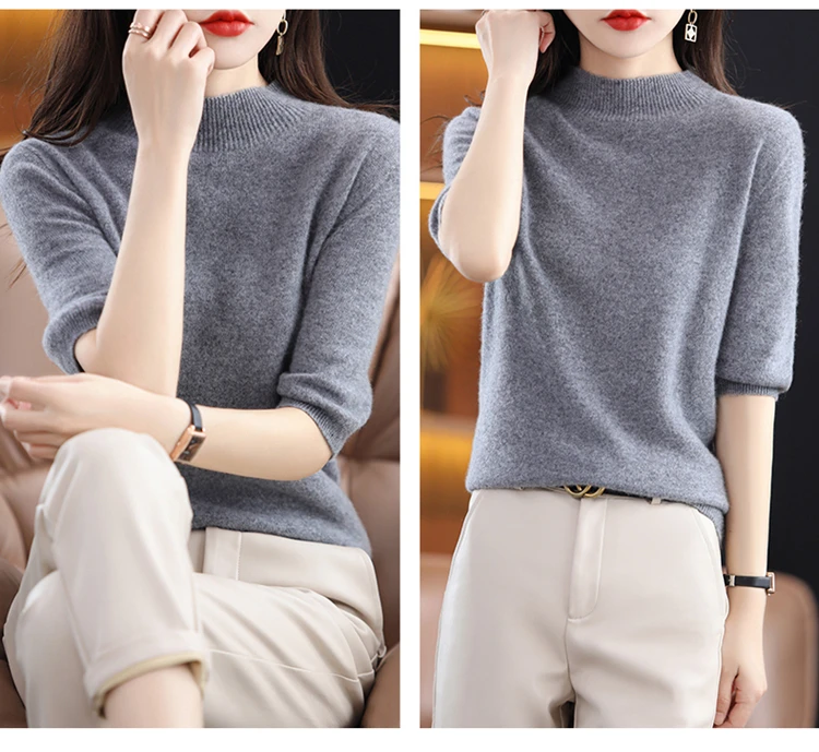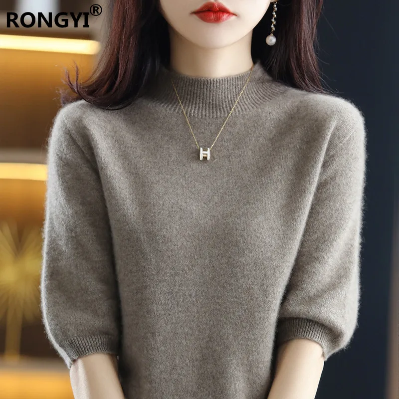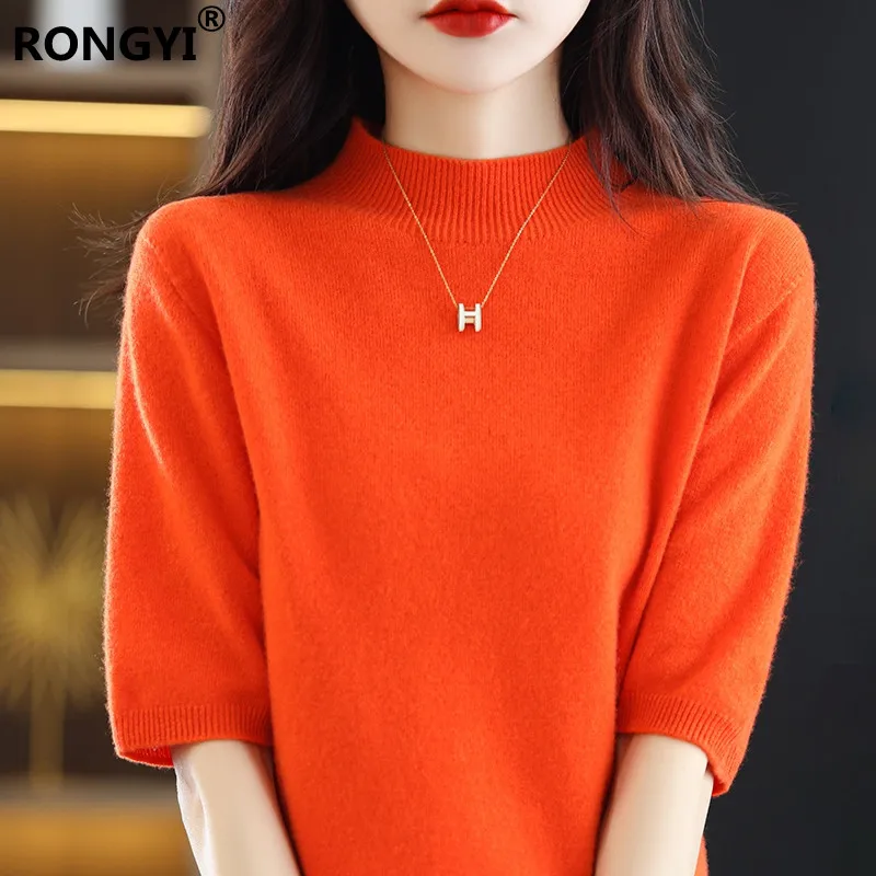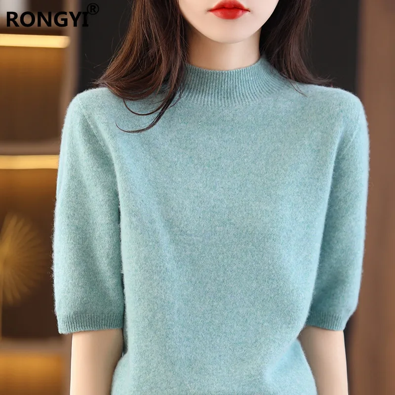 RONGYI سلس سترة الكشمير المعنقة محبوك المرأة الملابس 100% الصوف الخالص قصيرة الأكمام 2022 الربيع خمسة أرباع كم البلوز