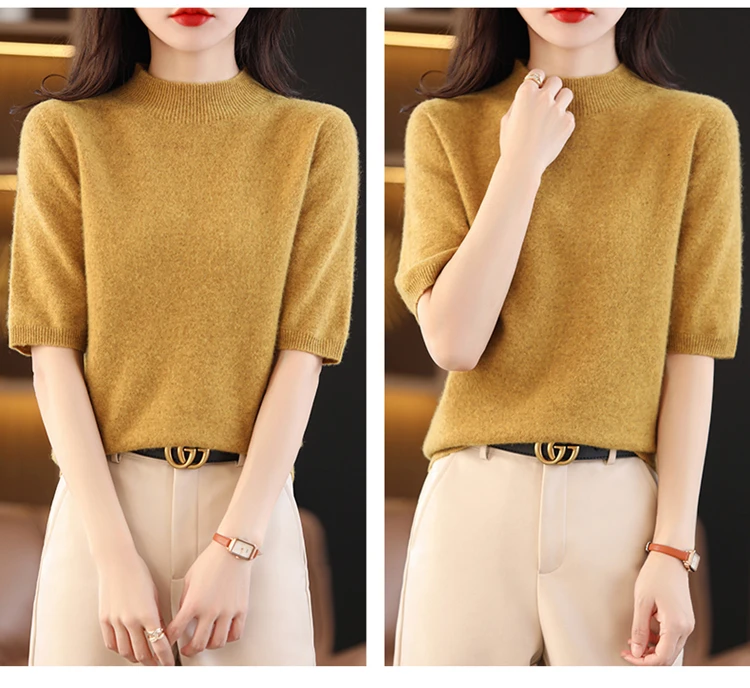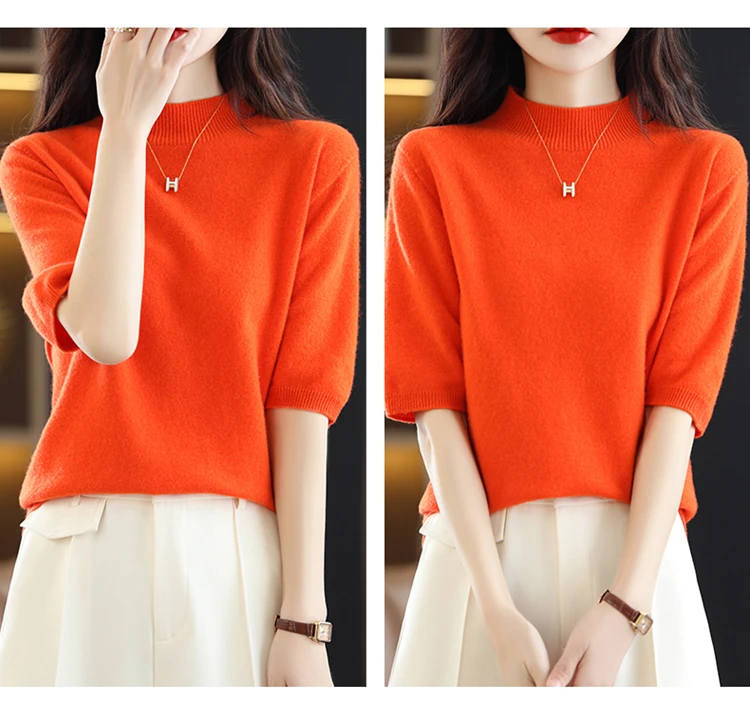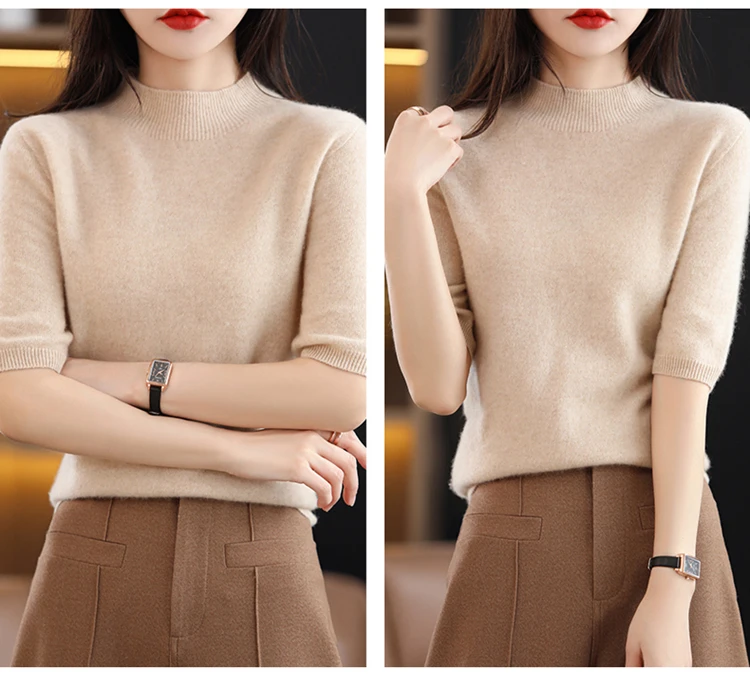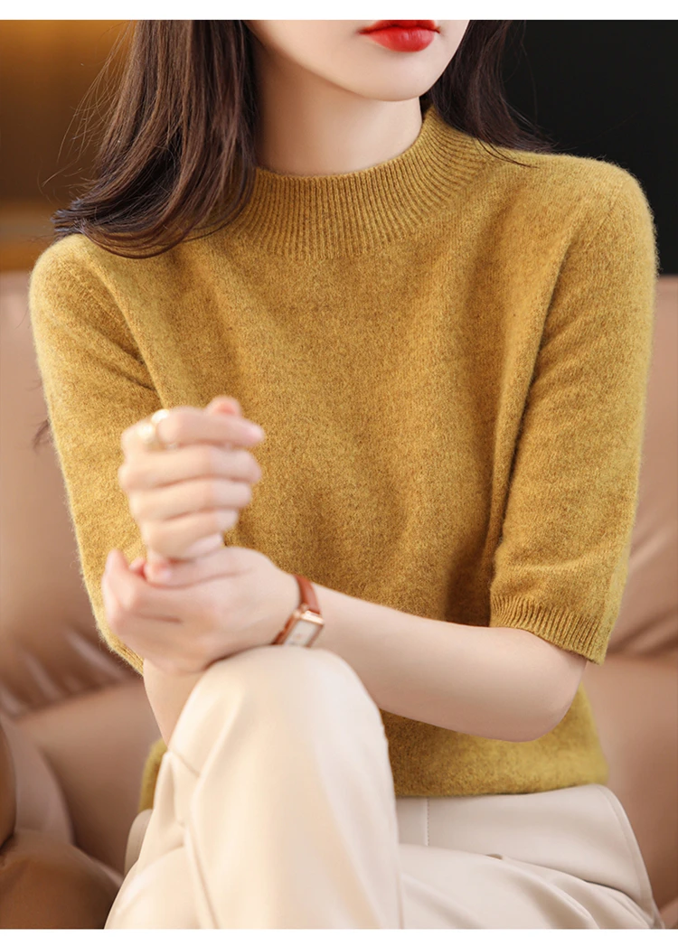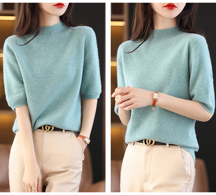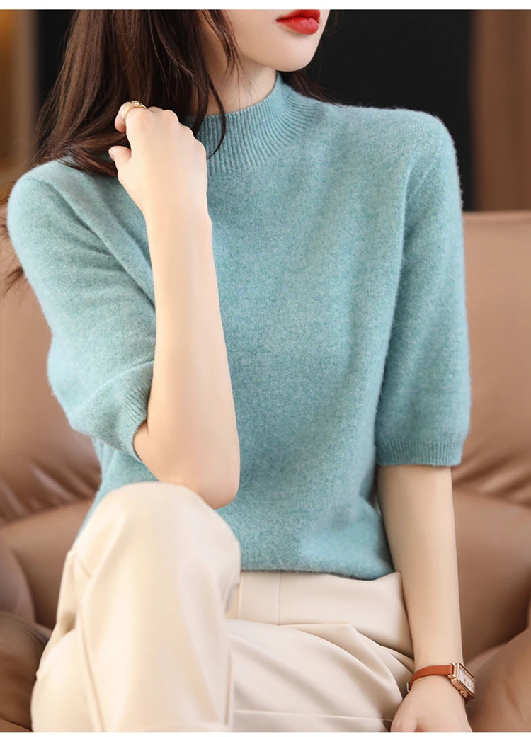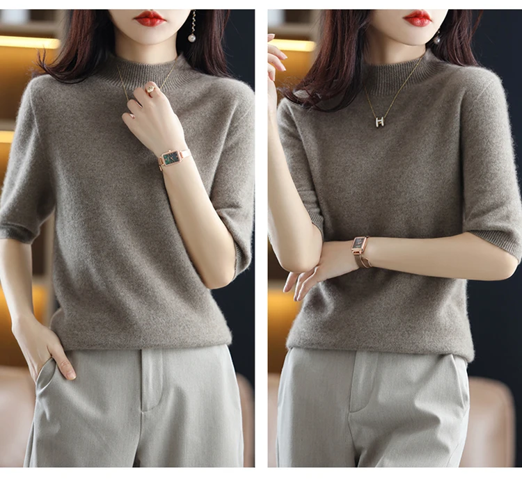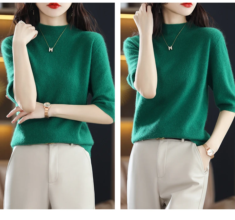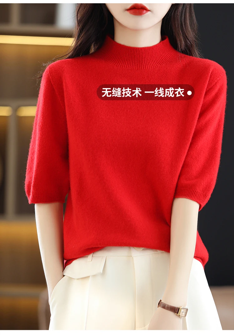 RONGYI سلس سترة الكشمير المعنقة محبوك المرأة الملابس 100% الصوف الخالص قصيرة الأكمام 2022 الربيع خمسة أرباع كم البلوز
