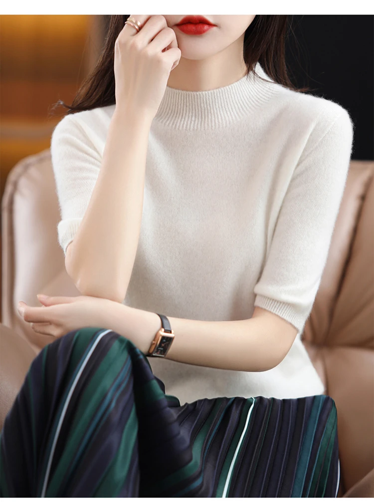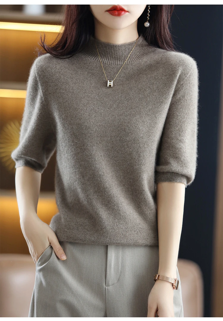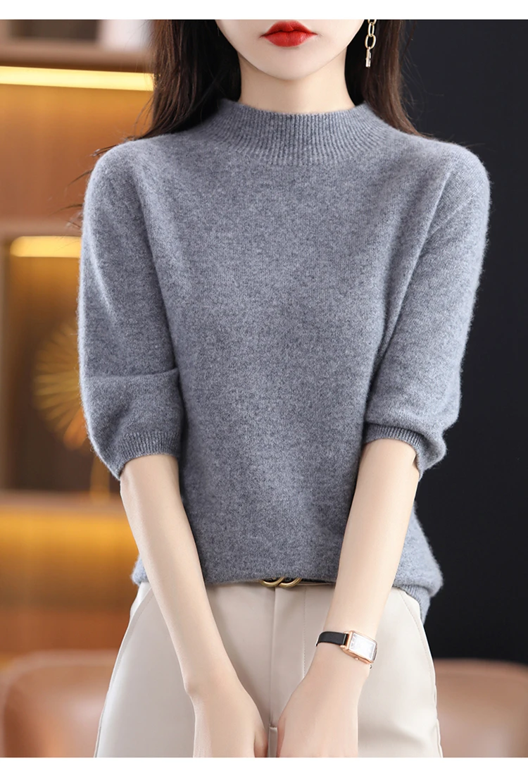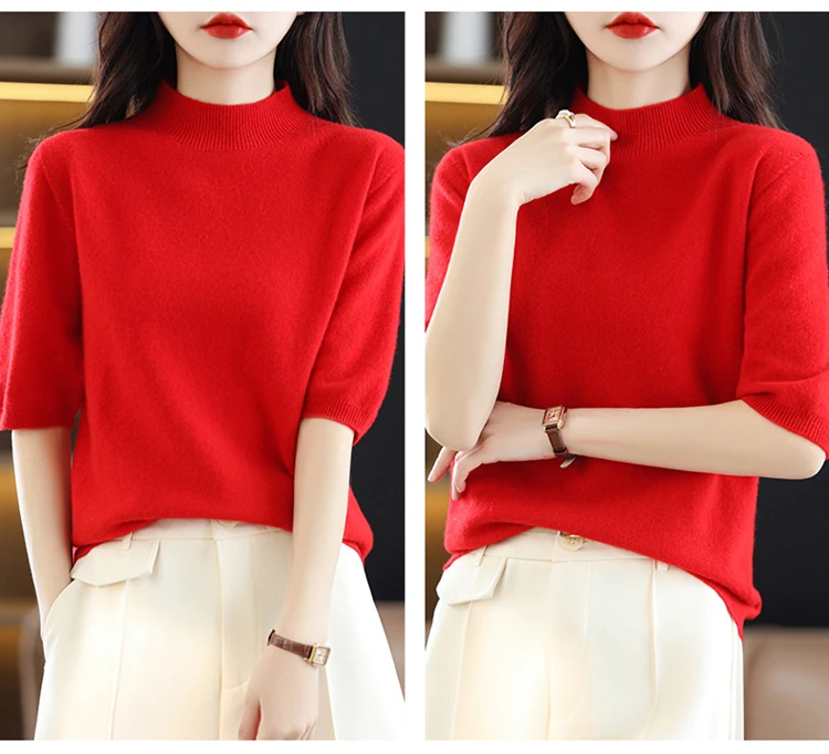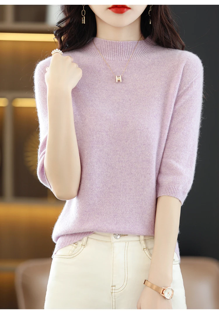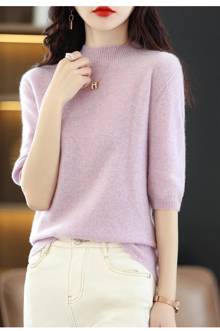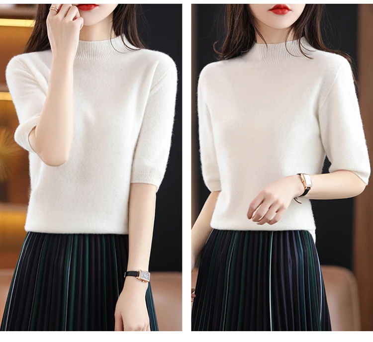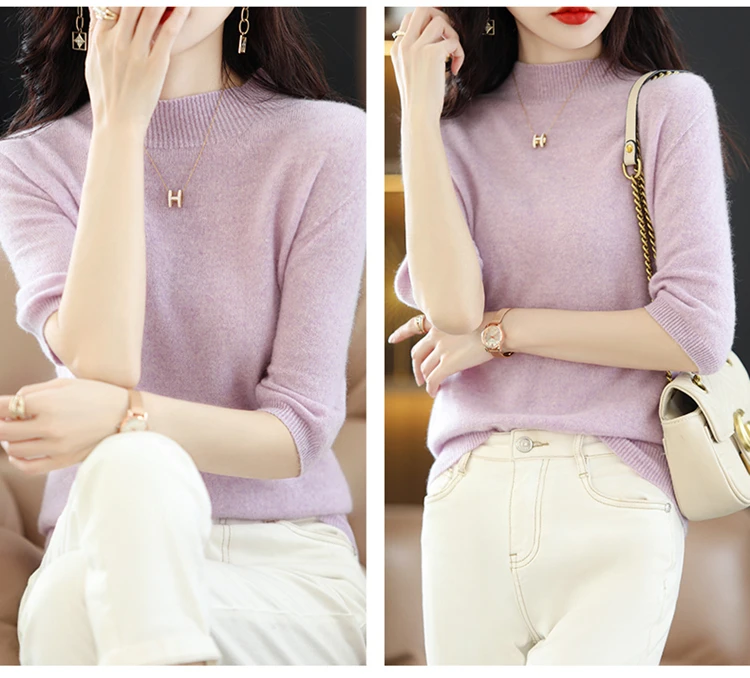 RONGYI سلس سترة الكشمير المعنقة محبوك المرأة الملابس 100% الصوف الخالص قصيرة الأكمام 2022 الربيع خمسة أرباع كم البلوز