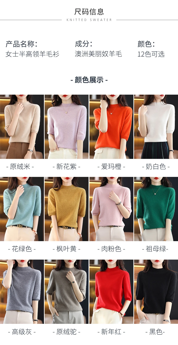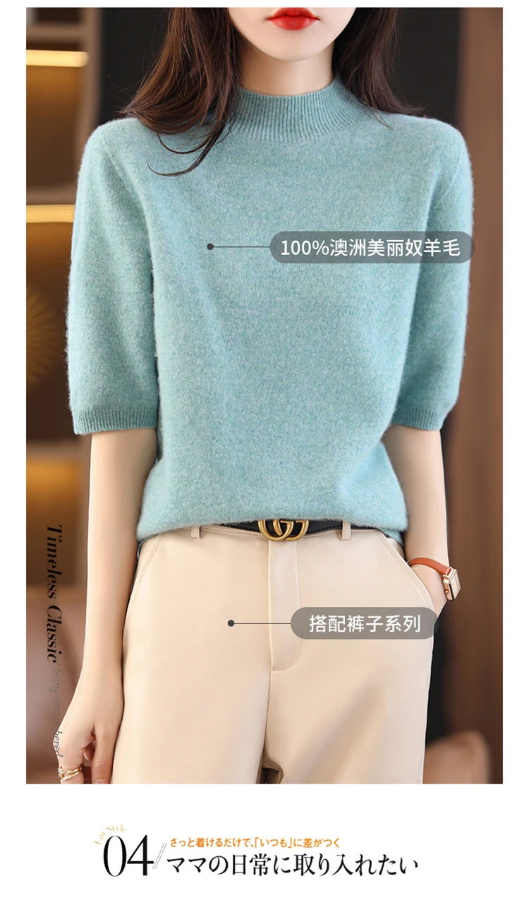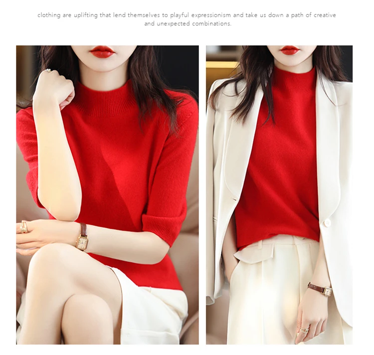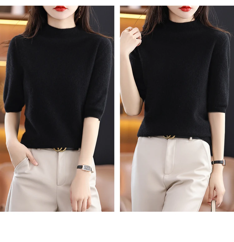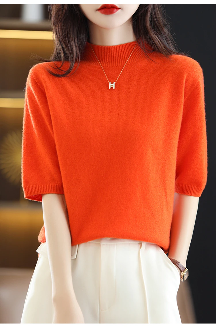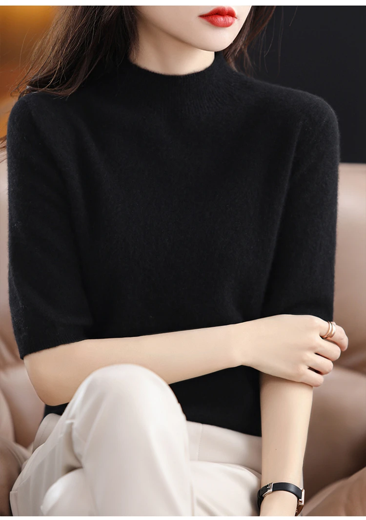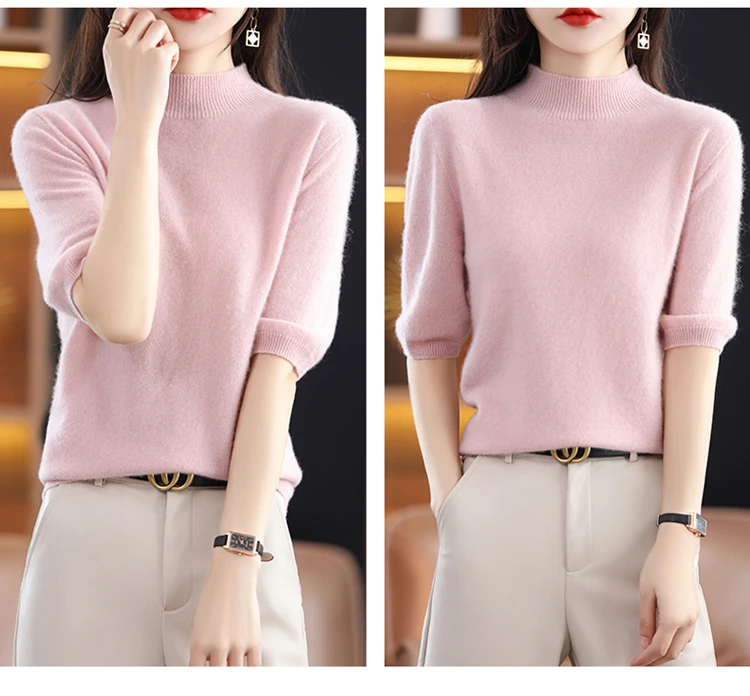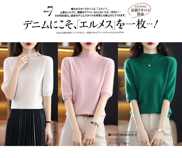 RONGYI سلس سترة الكشمير المعنقة محبوك المرأة الملابس 100% الصوف الخالص قصيرة الأكمام 2022 الربيع خمسة أرباع كم البلوز